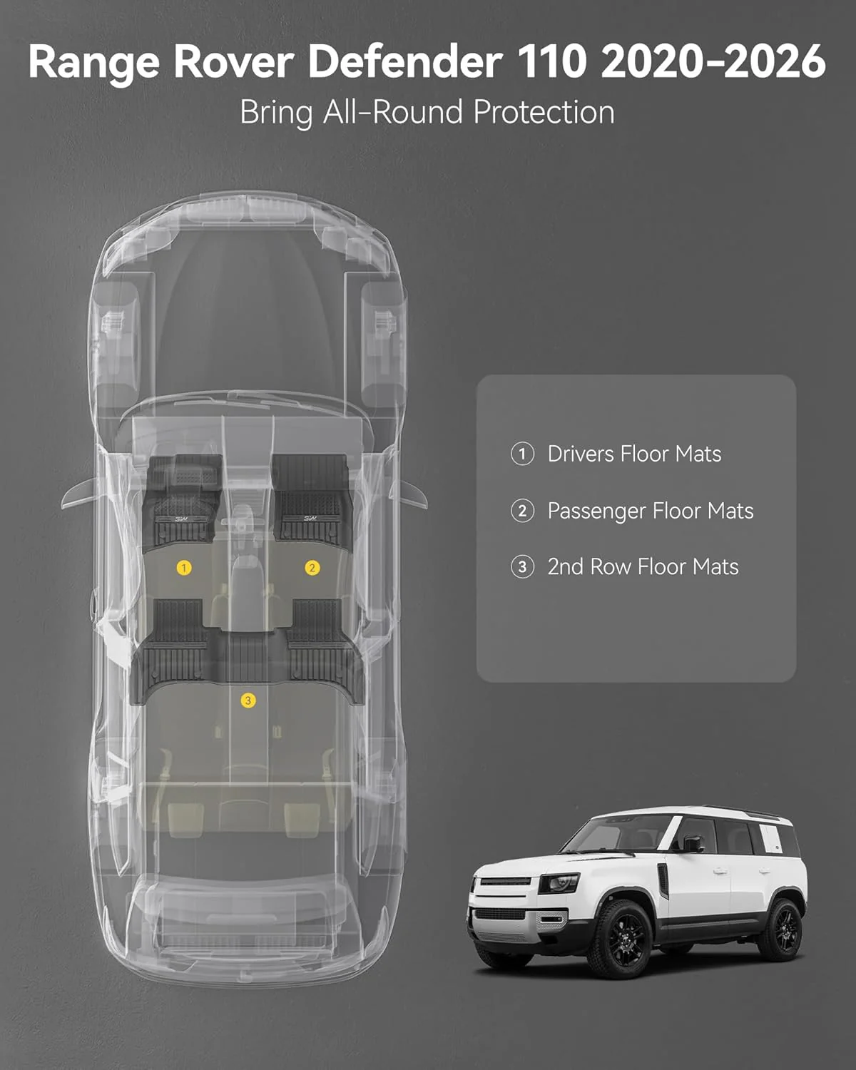 تم تصنيع هذه دعاسات الأمامية خصيصًا لسيارة لاند روفر ديفيندر لسنوات 2020 : 2026 باستخدام أجهزة قياس ليزر ثلاثية الأبعاد لضمان أبعاد دقيقة وتطابق مثالي مع شكل السيارة الداخلي، مما يحمي قيمة السيارة عند إعادة البيع.